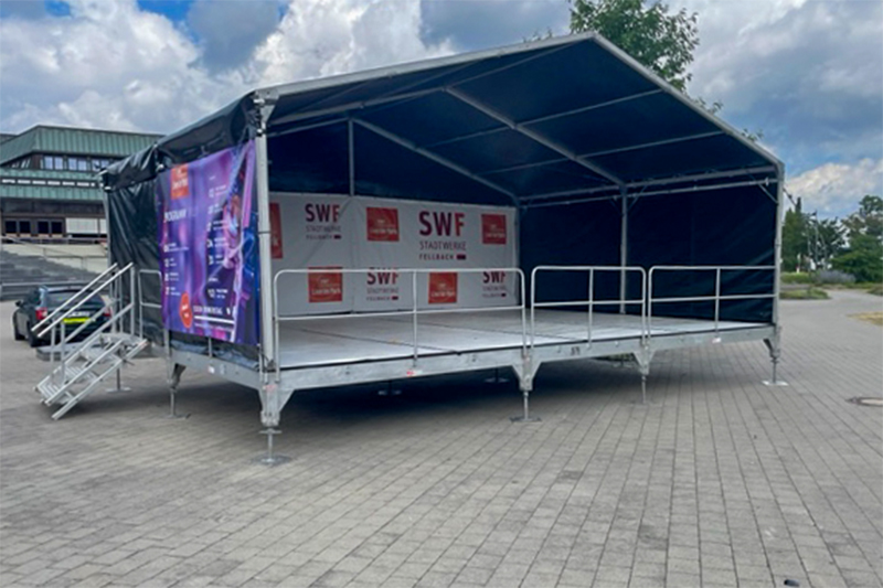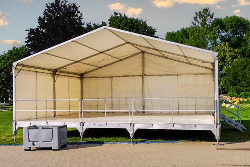 Von der kleinen Präsentationsfläche bis zum kompletten Bühnenaufbau mit Dach, Treppen und Geländern liefern wir zuverlässige Technik, die Sicherheit und Wirkung verbindet. Ergänzt durch passende Ausstattung entsteht eine Bühne, die funktioniert – und überzeugt.